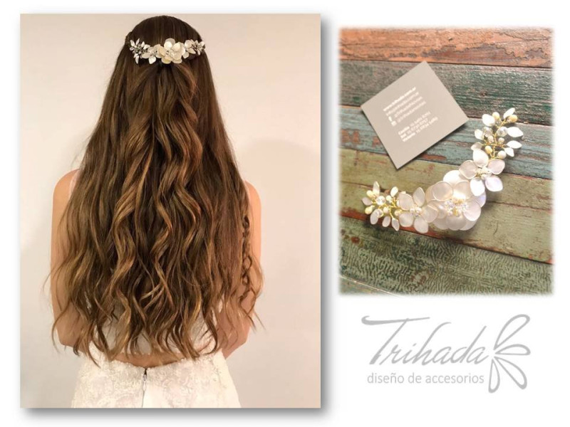 Tocado simetrico compuesto por 3 flores y laterales de ramitas. Tobalidades a eleccion