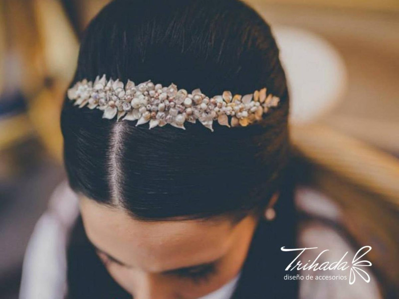 Tocado a medida con materiales a eleccion, flexible y versatil, se puede aplicar tanto en el frente como detras, en un semirecogido o rodete bajo.