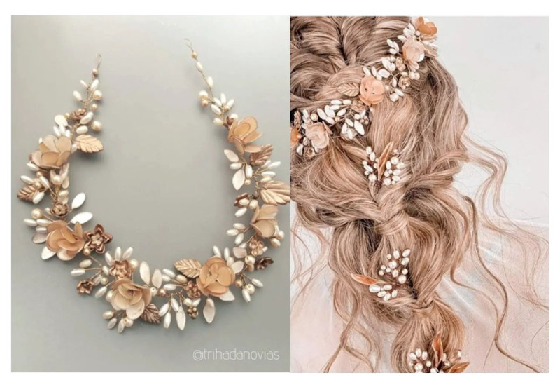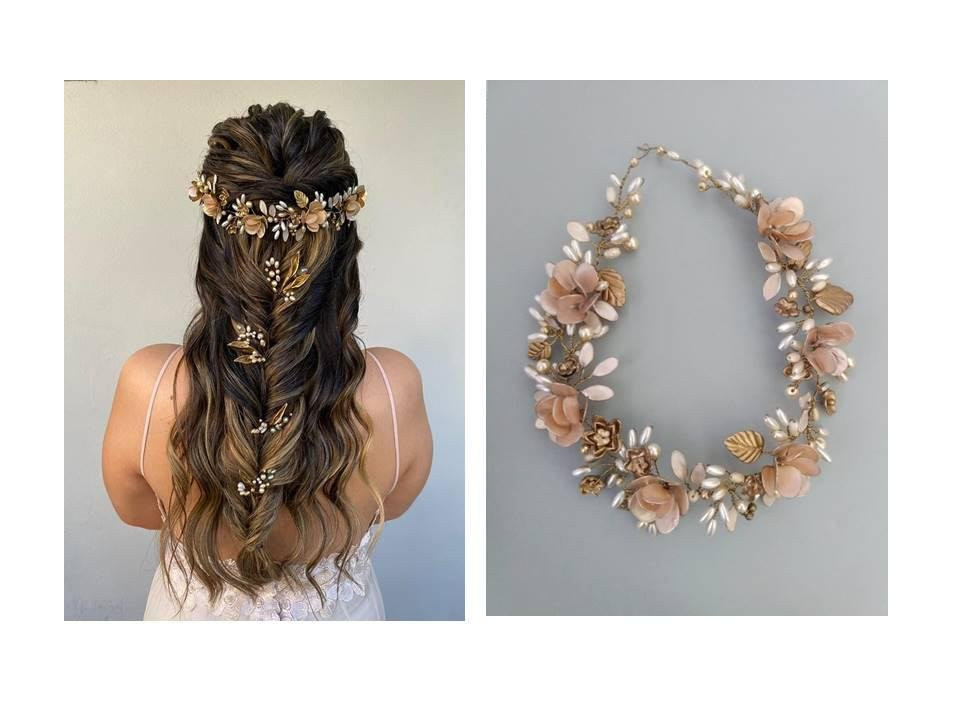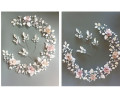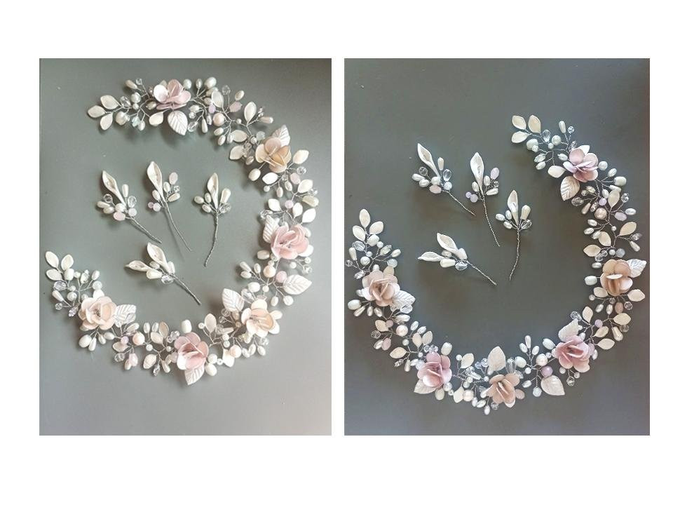 Diseño de corona con flores arrepolladas acompañadas de hojitas de porcelana y mix de materiales.