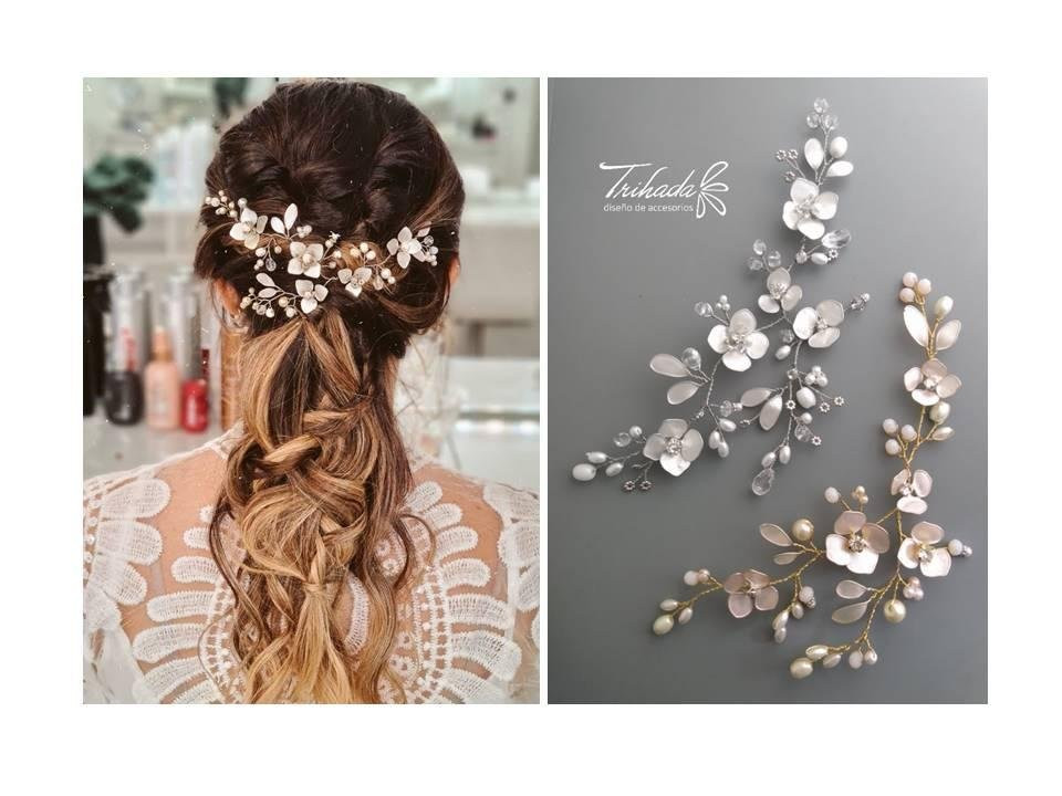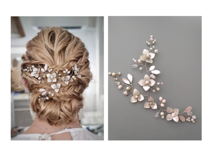 Tocado super versatil, flores pequeñas con ramitas y mucho romanticismo