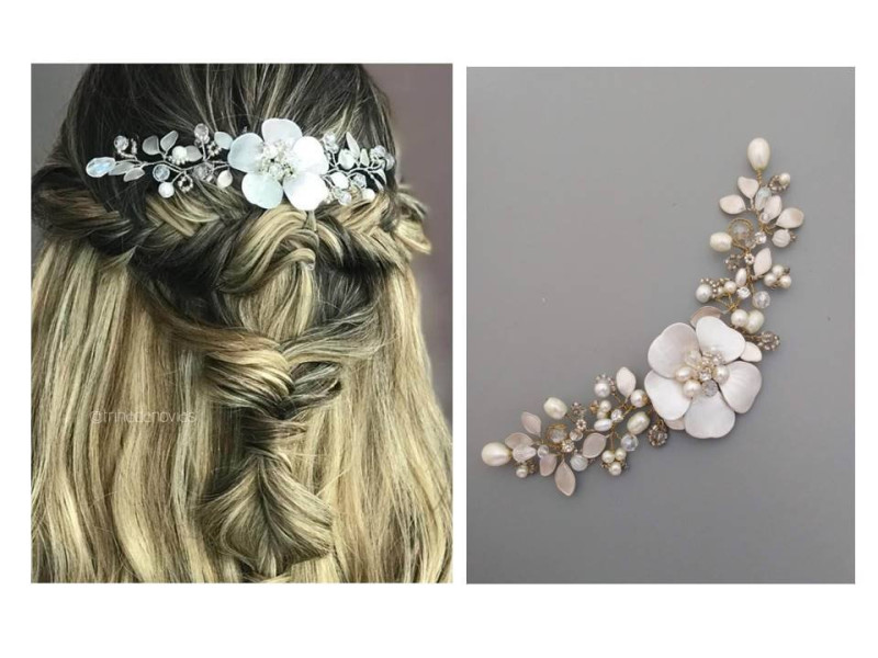 Tocado de flor central y ramitas de hojitas y combinación de materiales.