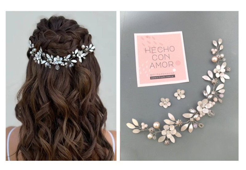 Tocado simétrico de hojas alargadas y mini flores.