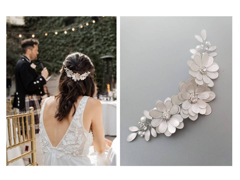 Tocado de 16 cm compuesto por flores con volumen y ramitas laterales.