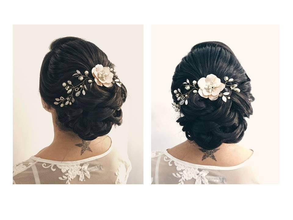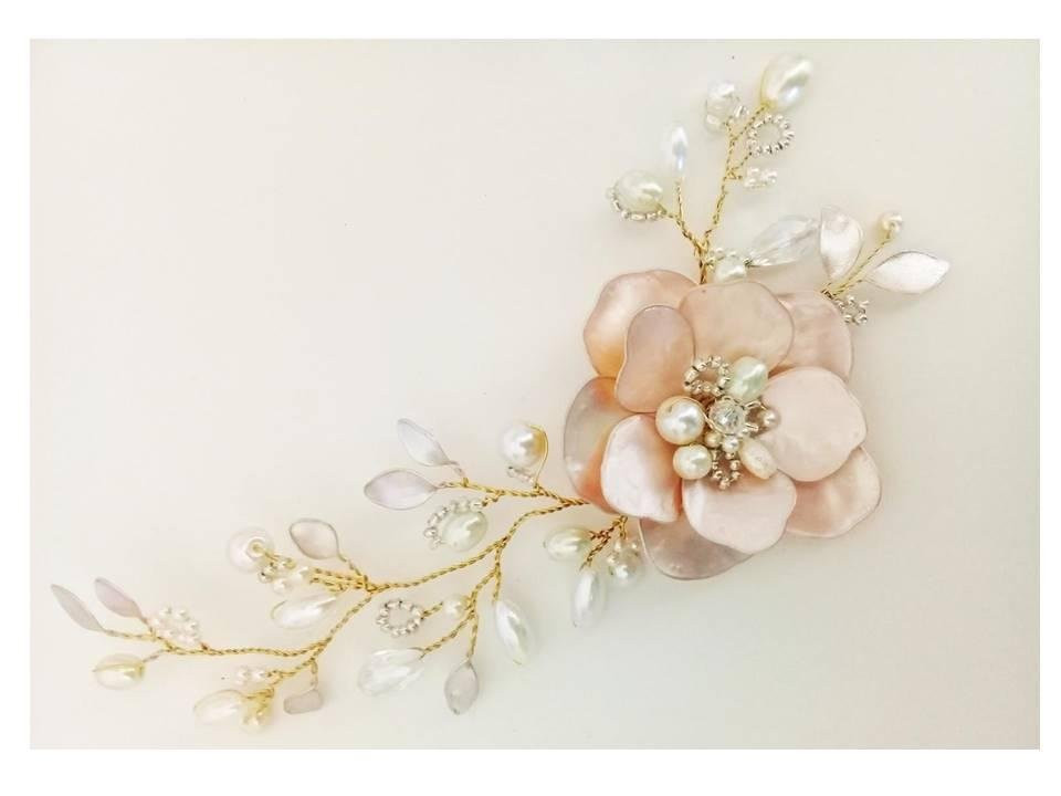 Tocado de ramitas con flor central o lateral, tonalidades a elección.