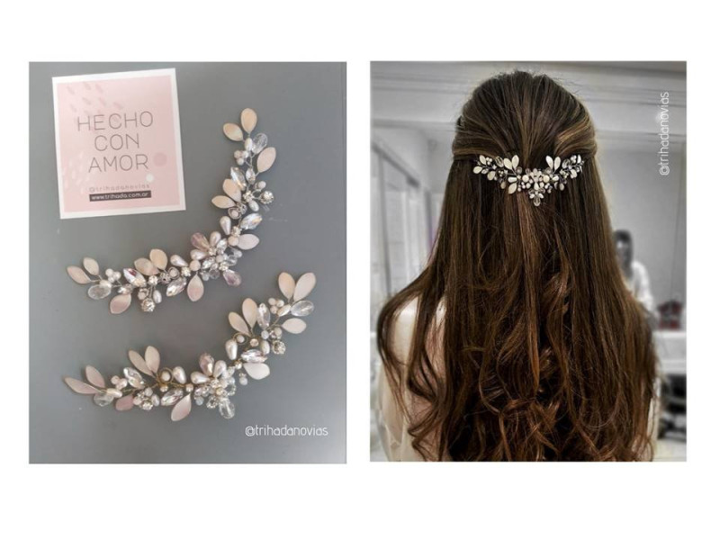 Tocado de 15 cm aproximadamente con hojas nacaradas y combinación de perlas, cristales, strass. Tonalidades a elección. Ideal para quinceañeras.TAGS