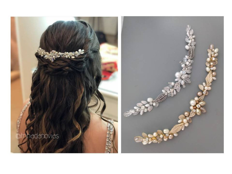 Tocado Sabrina con detalles de hojas metalicas o de porcelana. Tonalidades a eleccion