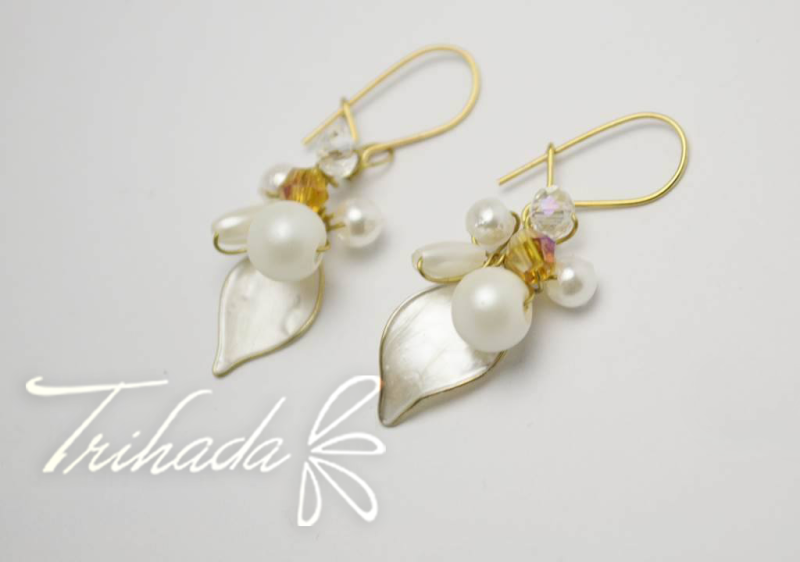 Pequeños aros compuestos por hojita de nacar perlas y cristales caramelos.