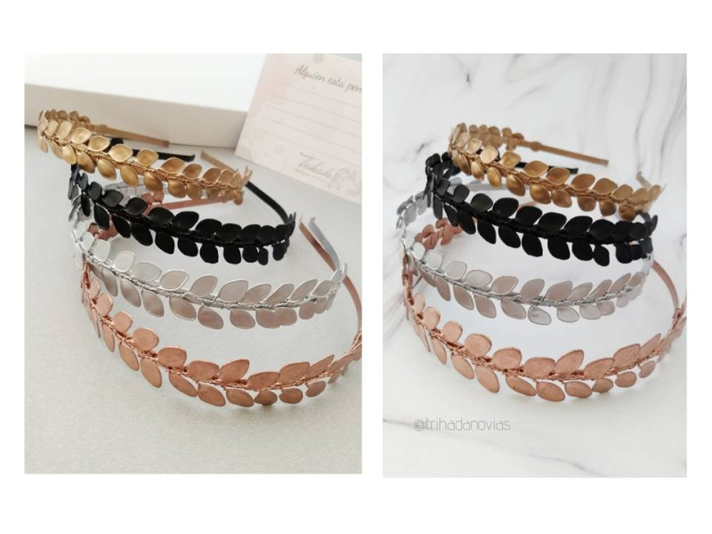 Vincha de hojas en forma de espiga, acompaña cualquier look en tonos: dorado, plateado, cobre o negro mate.