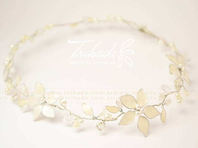 Tiara con florcitas nacaradas, cistalitos y detalles en plata.